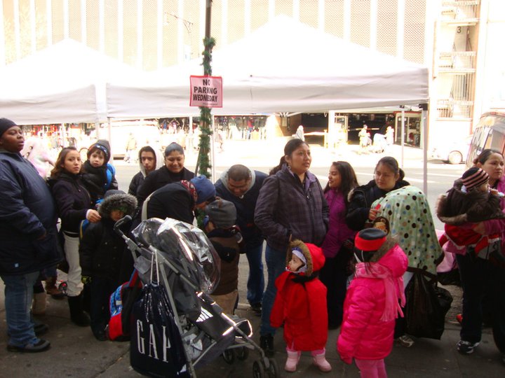 Lines of community members accepting for donations. Food, clothes, and gifts during the holidays.
